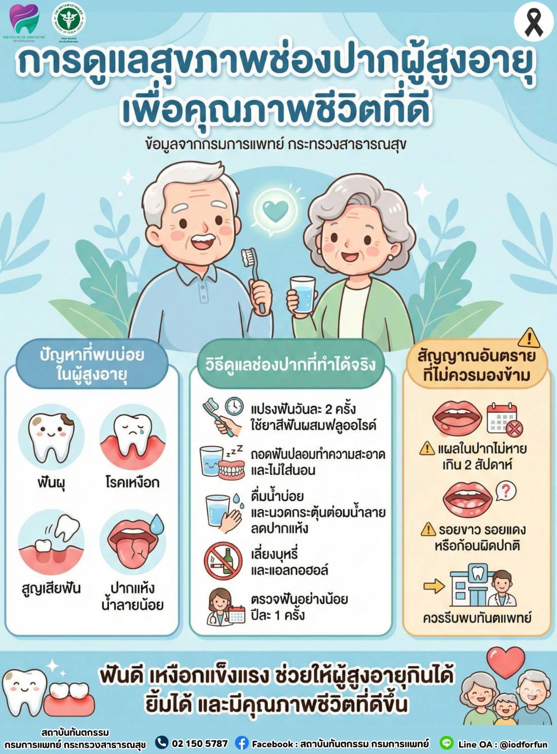 สถาบันทันตกรรม กรมการแพทย์ แนะดูแลสุขภาพช่องปากผู้สูงอายุอย่างรอบด้าน เน้นการใช้ฟลูออไรด์เสริม การบริหารกล้ามเนื้อช่องปาก และการตรวจคัดกรองมะเร็งในช่องปาก เพื่อคุณภาพชีวิตที่ดี