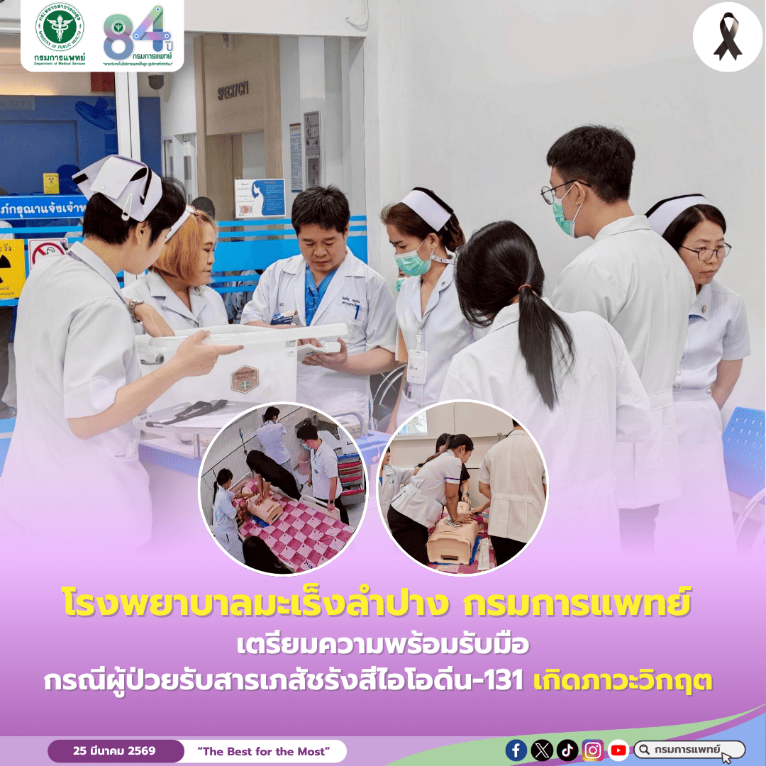 โรงพยาบาลมะเร็งลำปาง กรมการแพทย์ เตรียมความพร้อมรับมือกรณีผู้ป่วยรับสารเภสัชรังสีไอโอดีน-131 เกิดภาวะวิกฤต