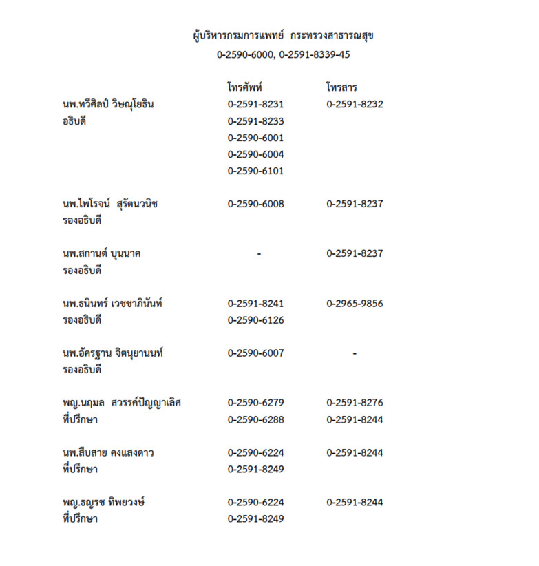 | 25 | สถาบันโรคผิวหนัง | นายแพทย์ปุณวิศ สุทธิกุลณเศรษฐ์ | รองผู้อำนวยการด้านพัฒนาระบบสุขภาพ | 081 9176964 |