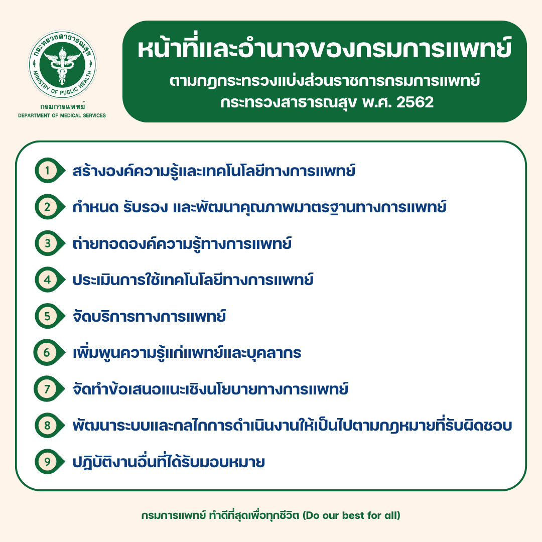 พัฒนาวิชาการด้านการบำบัดรักษาและฟื้นฟูสมรรถภาพทางการแพทย์ฝ่ายกาย โดยมีการศึกษา วิจัย พัฒนา และถ่ายทอดองค์ความรู้และเทคโนโลยีทางการแพทย์ที่เหมาะสม การเพิ่มพูนความรู้และทักษะการปฏิบัติงานแก่บุคลากรทางการแพทย์เฉพาะทางที่มีคุณภาพ ให้บริการทางการแพทย์เฉพาะด้านหรือในระดับตติยภูมิที่ยุ่งยากซับซ้อนอย่างได้มาตรฐานเพื่อให้ผู้รับบริการพึงพอใจ (๑) ศึกษา วิเคราะห์ วิจัย พัฒนา และสร้างองค์ความรู้และเทคโนโลยีทางการแพทย์ และการแพทย์เฉพาะทาง เป็นศูนย์อ้างอิงทางการแพทย์ รวมทั้งดำเนินการและประสานงานกับหน่วยงานอื่นที่เกี่ยวข้องทั้งในประเทศและต่างประเทศในเรื่องดังกล่าว (๒) กำหนด รับรอง และพัฒนาคุณภาพมาตรฐานทางการแพทย์ (๓) ถ่ายทอดองค์ความรู้และเทคโนโลยีทางการแพทย์และการแพทย์เฉพาะทางแก่สถานบริการสุขภาพทั้งภาครัฐและภาคเอกชน (๔) ประเมินการใช้เทคโนโลยีทางการแพย์ของสถานบริการสุขภาพทุกระดับให้เหมาะสมและคุ้มค่า (๕) จัดให้มีบริการเพื่อรองรับการส่งต่อผู้ป่วยระดับตติยภูมิแลพาะโรคหรือเฉพาะทาง (๖) ให้การเพิ่มพูนความรู้และทักษะการปฏิบัติงานด้านการบำบัดรักษาและฟื้นฟูสมรรถภาพทางการแพทย์ และอื่น ๆ ที่เกี่ยวข้องแก่แพทย์และบุคลากรทางด้านสุขภาพทั้งภาครัฐและภาคเอกชน (๗) จัดทำข้อเสนอแนะเชิงนโยบายทางการแพทย์เพื่อยกระดับมาตรฐานการให้บริการระบบสุขภาพ (๘) พัฒนาระบบและกลไกการดำเนินงานให้เป็นไปตามกฎหมายที่อยู่ในความรับผิดชอบ (๙) ปฏิบัติการอื่นใดตามที่กฎหมายกำหนดให้เป็นหน้าที่และอำนาจของกรม หรือตามที่รัฐมนตรีหรือคณะรัฐมนตรีมอบหมาย